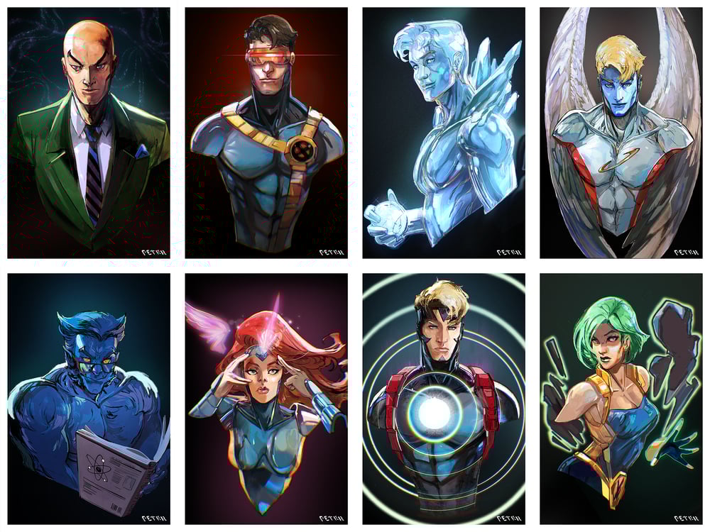 This product includes 8 mini print set of the original X-men the Animated Series with all the guest stars of the series. All of the 8 prints will be signed by Peter Nguyen the artist. Each print measures out 6 by 9 and together all 8 make a rainbow with a black and white.