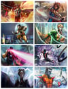 This product includes 8 mini print set of the eight mutants rescure the other mutants or krakoa.They can be added to supplement other sets and future sets, All of the 8 prints will be signed by Peter Nguyen the artist. Each print measures out 6 by 9 inches and together all 8 make a rainbow with a extra set of black and white.